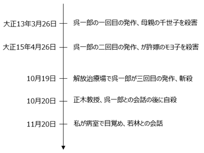 「私」が目覚めたのは大正15年11月20日のことであり、若林教授からは「正木教授は一ヶ月前に自殺した」と告げられる。