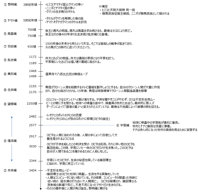 「黎明編」のラストでは生命の希望が描かれ、続く各編では過ちを繰り返す人類の歴史が綴られます。